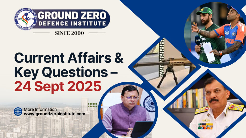 Daily Current Affairs & Key Questions for NDA & Competitive Exams – 24 September 2025 Introduction Stay ahead in NDA preparation with today’s summary of the latest current affairs from politics, defense, geopolitics, economy, environment, science, technology, and sports. This post covers the most relevant topics for the NDA exam and other competitive tests, helping aspirants track key developments in real time. Key Recent Current Affairs Highlights Politics & Governance Union Education Minister launched the Viksit Bharat Buildathon 2025, India’s largest school […]